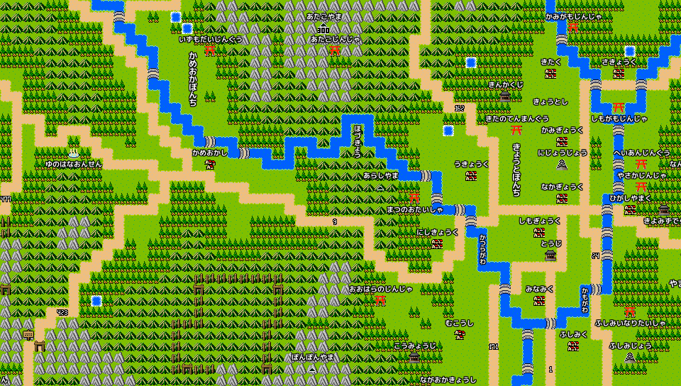 2021-11-09 京都市 亀岡市 向日市 260京都 イラストマップを歩くプログラムを起動します。初回の起動は30秒くらいかかります。 拡大したマップを表示します。初回の起動は30秒くらいかかります。 ■町 京都市(きょうとし) 北区(きたく) 上京区(かみぎょうく) 左京区(さきょうく) 中京区(なかぎょうく) 東山区(ひがしやまく) 下京区(しもぎょうく) 南区(みなみく) 右京区(うきょうく) 伏見区(ふしみく) 西京区(にしきょうく) 亀岡市(かめおかし) 向日市(むこうし) ■盆地 亀岡盆地(かめおかぼんち) 京都盆地(きょうとぼんち) ■渓谷 保津峡(ほづきょう) ■山 愛宕山(あたごやま) 嵐山(あらしやま) ポンポン山(ぽんぽんやま) ■河川 桂川(かつらがわ) 鴨川(かもがわ) ■温泉 湯の花温泉(ゆのはなおんせん) ■神社 愛宕神社(あたごじんじゃ) 大原野神社(おおはらのじんじゃ) 北野天満宮(きたのてんまんぐう) 伏見稲荷大社(ふしみいなりたいしゃ) 平安神宮(へいあんじんぐう) 松尾大社(まつのおたいしゃ) 八坂神社(やさかじんじゃ) 出雲大神宮(いずもだいじんぐう) 上賀茂神社(かみがもじんじゃ) 下鴨神社(しもがもじんじゃ) ■寺院 清水寺(きよみずでら) 金閣寺(きんかくじ) 光明寺(こうみょうじ) 東寺(とうじ) ■城 二条城(にじょうじょう) 伏見城(ふしみじょう) ※1マップサイズ おおよそ 横:30km 縦:17km ※2イラストサイズ 横:960ピクセル 縦:544ピクセル ※3マップチップについて ※4イラストマップやプログラムの利用について ※5イラストマップを歩くプログラムの操作について Lot. 30040076